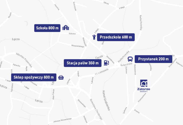 Osiedle Zatorze to nie tylko naturalne otoczenie, ale i wysoki komfort codziennego życia. Położenie inwestycji zapewnia łatwy dostęp do pełnej infrastruktury miasta – bez względu na to, czy mowa o poruszaniu się pieszo, samochodem, czy transportem publicznym (najbliższy przystanek autobusowy znajduje się 200 metrów od osiedla). W kilka minut można dotrzeć m.in. do kilku sklepów spożywczych (np. Dino, Biedronka), punktów usługowych, stacji benzynowej, kościoła, paczkomatu, apteki i przychodni.
