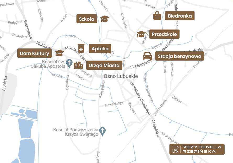Zobacz na Mapach Google!Dużą zaletą położenia Rezydencji Rzepińskiej jest bardzo komfortowy dostęp do pełnej infrastruktury miasta. Do ścisłego centrum Ośna Lubuskiego z urzędem gminy, domem kultury, kościołem, apteką i skwerem można dotrzeć pieszo w ok. 15 min. Niedaleko do sklepów spożywczych oraz popularnych marketów – Dino czy Biedronka znajdują się tylko 2 min jazdy samochodem od inwestycji. W okolicy nie brakuje przydatnych na co dzień punktów usługowych. Blisko również paczkomat, przychodnia, przedszkole i szkoła podstawowa. Ponadto ważnym atutem lokalizacji Rezydencji Rzepińskiej jest wygodny dostęp do drogi wojewódzkiej nr 137, prowadzącej np. do przejścia granicznego w Słubicach (ok. 25 min jazdy samochodem).